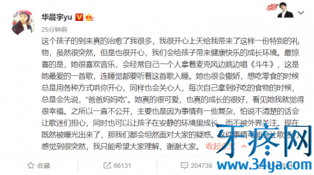 今天下午17:50前后,华晨宇和张碧晨相继发文,验证了这两天在社交网络上传得沸沸扬扬的“3000万顶流”生子传闻。