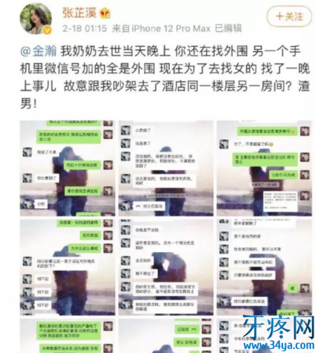 2月18号凌晨1点多,张芷溪发了条微博@金瀚,附上了聊天记录。文案是奶奶去世的那天,金瀚还在找外围,手机里微信号加的全是外围,为了去找女的,找了一晚上,故意跟张芷溪吵架是去了酒店同一楼层另一房间?